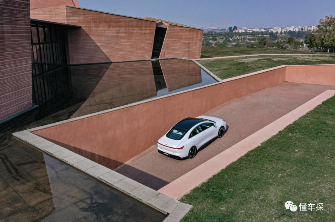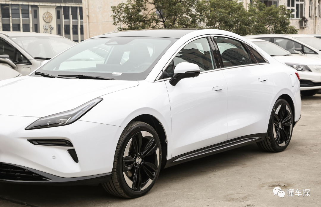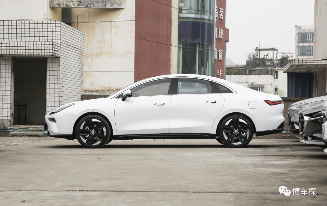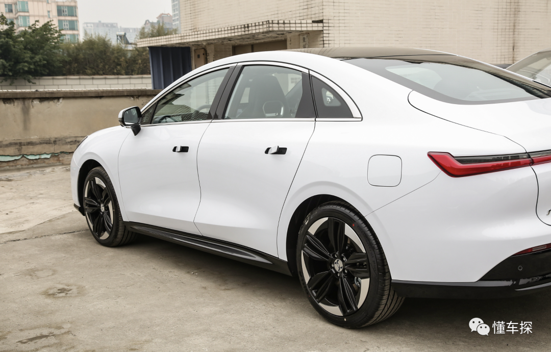 来到侧面,我们往往会被这款车的轿跑姿态吸引,流畅的车顶溜背确实能吸引年轻人,与此同时这款车还设计了最合适的空气动力学夹角,158°前风窗倾角+15°尾窗夹角都是精雕细琢后得出的数据,能在行驶时让风流畅地通过前风挡,兼顾低风阻和下压力,最终整车拥有0.217cd的超低风阻,风阻系数比特斯拉Model
