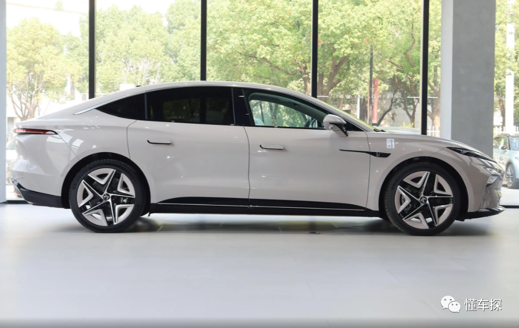 像五角星一样的轮圈是车侧最吸引人的存在,造型简洁彰显出不错力量感,内部配备红色刹车卡钳出,充电接口被设计在左后翼子板处。