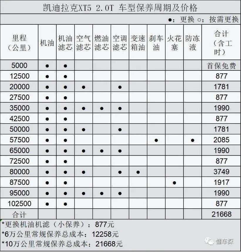 凯迪拉克XT5的首保同样在5000km进行,随后以7500km为保养周期,以一次小保养来看,主要对机油和机滤进行更换,费用大概在877元左右,照此计算,3年6万公里的用车周期内,凯迪拉克XT5的保养花费大约为12258元。