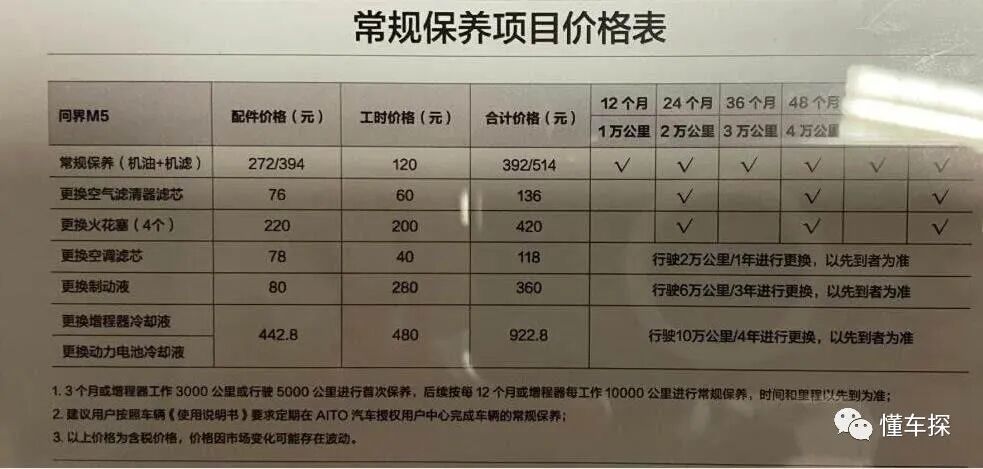根据官方的保养手册显示,问界M5在5000km时进行首次保养,随后每隔5000km都将进行常规的检查和相关部件的更换,12个月或1万公里时需要对增程器润滑油进行更换,30000km时需要对火花塞进行更换。