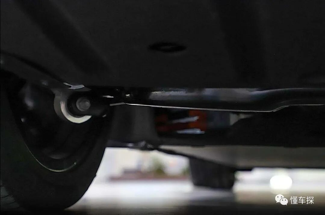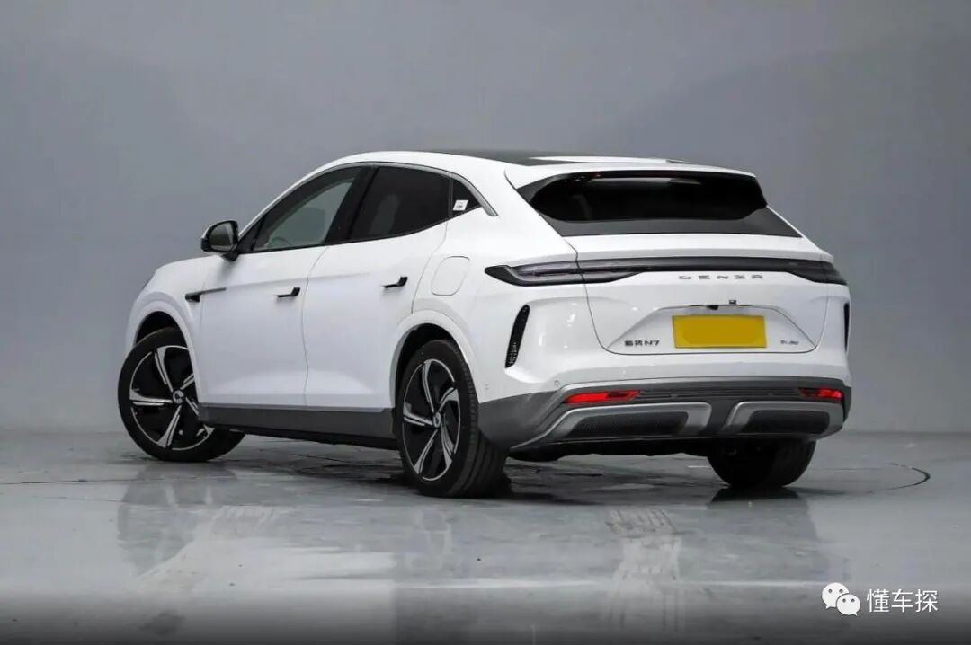 腾势N7的车尾更像是一台轿跑SUV,尾窗上沿带有一块镂空式的扰流板,中间还配有横条的刹车灯带,贯穿式的尾灯组两侧进行了加宽,略带熏黑的灯腔在点亮后更显前卫,后备厢顶部配有翘起的扰流板,下方则镶刻有字母LOGO,梯形轮廓的号牌区域两侧配有竖状的导流槽设计,后包围下方带有大面积的黑色组件覆盖,并配有横条示宽灯,车底还加入了枪灰色的饰条装饰,对称式的设计更显运动。
