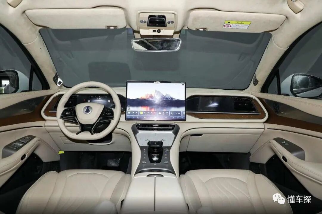走进腾势N7的车内,内饰的设计布局也与比亚迪其他车型有所不同,以中控区域为中轴形成了车内的对称式布局,同时与车门更为紧密的贴合设计也让车内带有了更强的环抱式氛围,腾势N7在用料上也保持了更高级的水准,不仅采用了大面积的软性面料包覆,同时还在增加了仿木纹饰板和烤漆材质进行装饰,使得车内整体质感进一步提升,台面中央配有一块大尺寸悬浮屏,仪表区与副驾前方也搭配了内嵌屏设计,在功能上更为丰富。