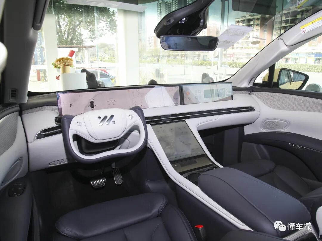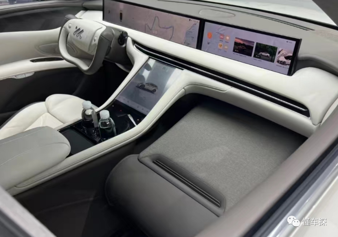 进入到车内,智己LS7非常注重豪华感和科技感的营造,首先深浅双拼内饰就显得比较上档次,也比较温馨,而且大面积的皮质软包覆盖,加上精致的拼接工艺,就能够凸显出不错的品质感,而且液晶仪表盘、中控屏以及副驾驶娱乐屏还采用了一体化贯穿式的设计,视觉冲击力很强,而空调出风口也采用了贯穿式设计,丰富了整个中控台的层次感,拉伸了车内的视觉宽度。