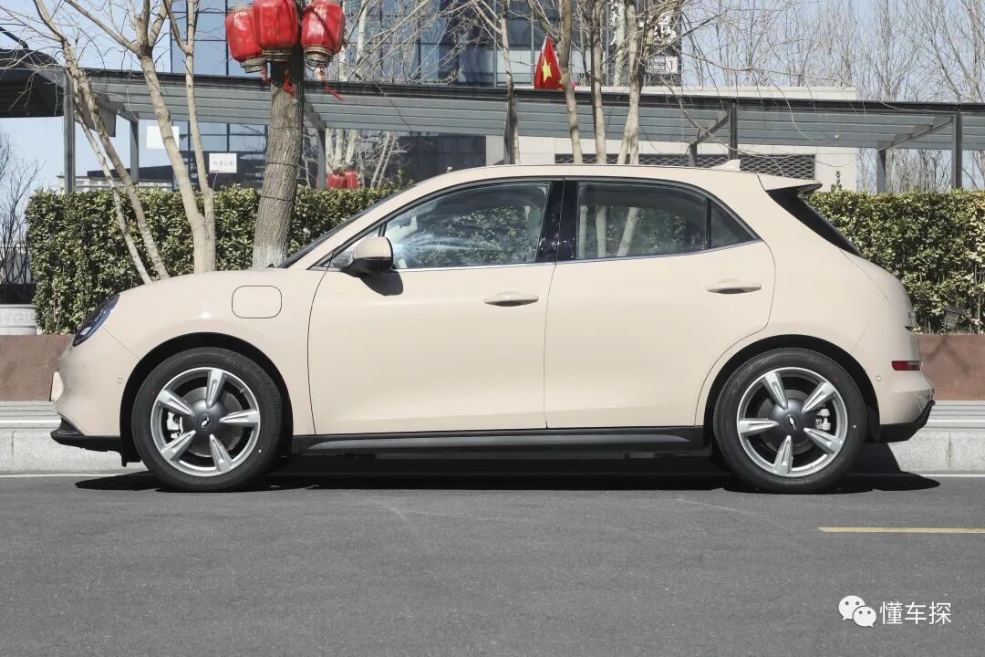 车身侧面,整体造型比较圆润,看起来比较可爱,车身尺寸方面,整车长宽高分别为4235x1825x1596mm,轴距为2650mm,比较符合其小型车的定位,整体看上去比较可爱。