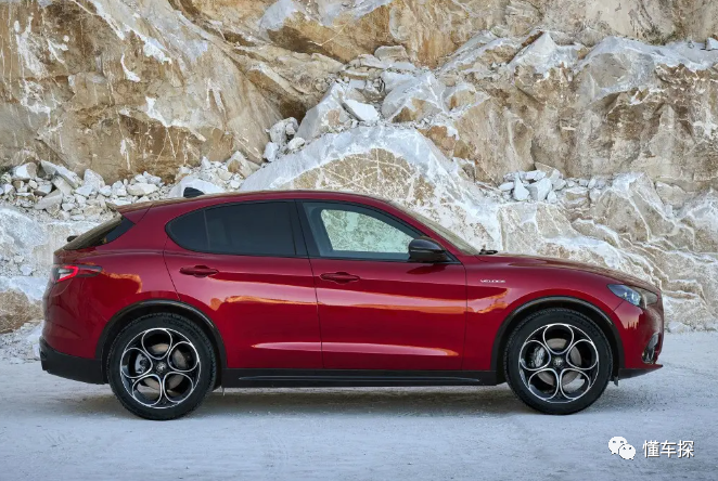侧身方面,全新阿尔法·罗密欧Stelvio和现款车型相比变化并不是很大,依旧是上扬式的腰线处理和平滑的车顶线条,再加上运动轮毂的加持,在精致程度上,新车还是很有保障的。