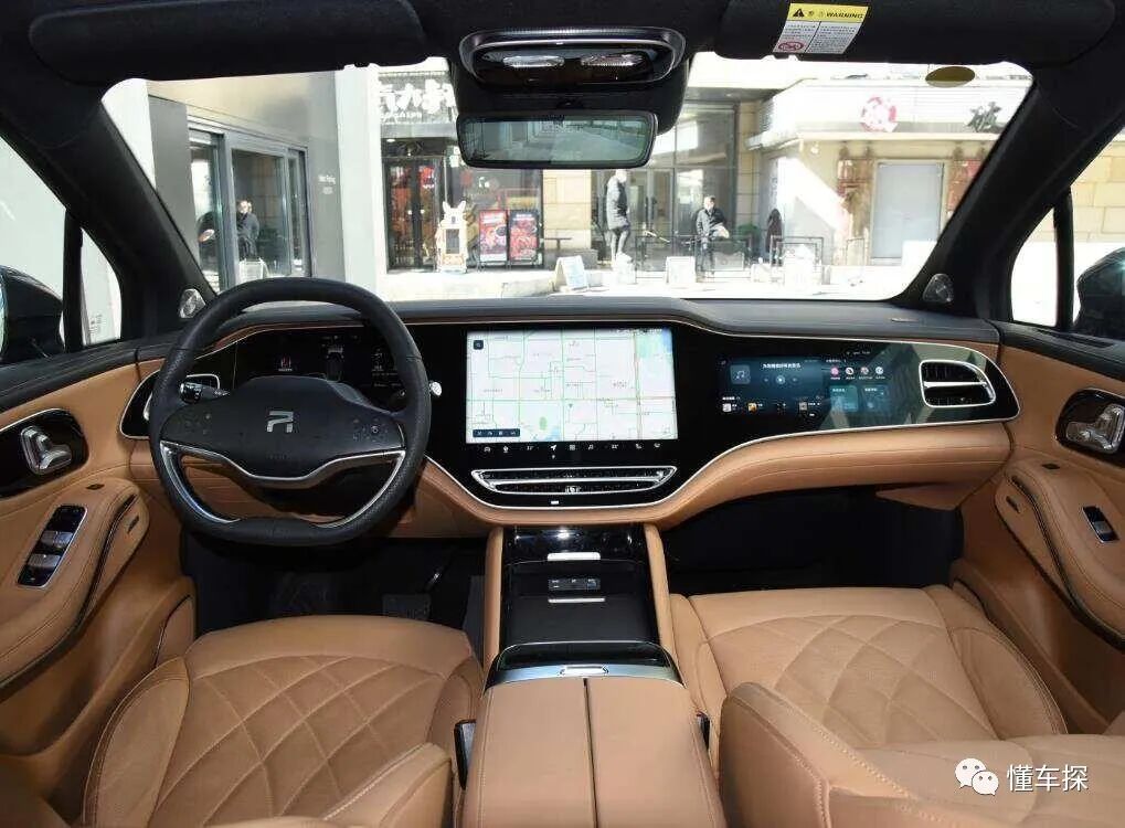 走进车内,飞凡R7拥有更为豪华和智能的内饰设计,视觉感上首先感受到的便是超大尺寸的AMOLED大联屏带来的冲击感,屏幕分为了仪表、中控和副驾三块区域,尺寸大小略有不同,两侧和中部配有镀铬封边的出风口,与烤漆面板搭配更显质感,触感上则能明显感受到车内用料的豪华,大面积的皮革和软性面料包裹下还在椅面进行了菱格缝线处理。