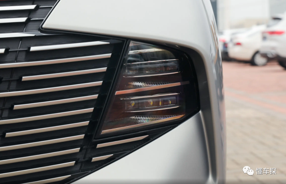 无边界大尺寸前格栅是最具辨识度的设计,熏黑背景表面交错分布多根银色金属条,就像是房屋结构般扎实,向两侧延伸过去与远近大灯衔接在一起,再次拉宽前脸横向视觉效果。