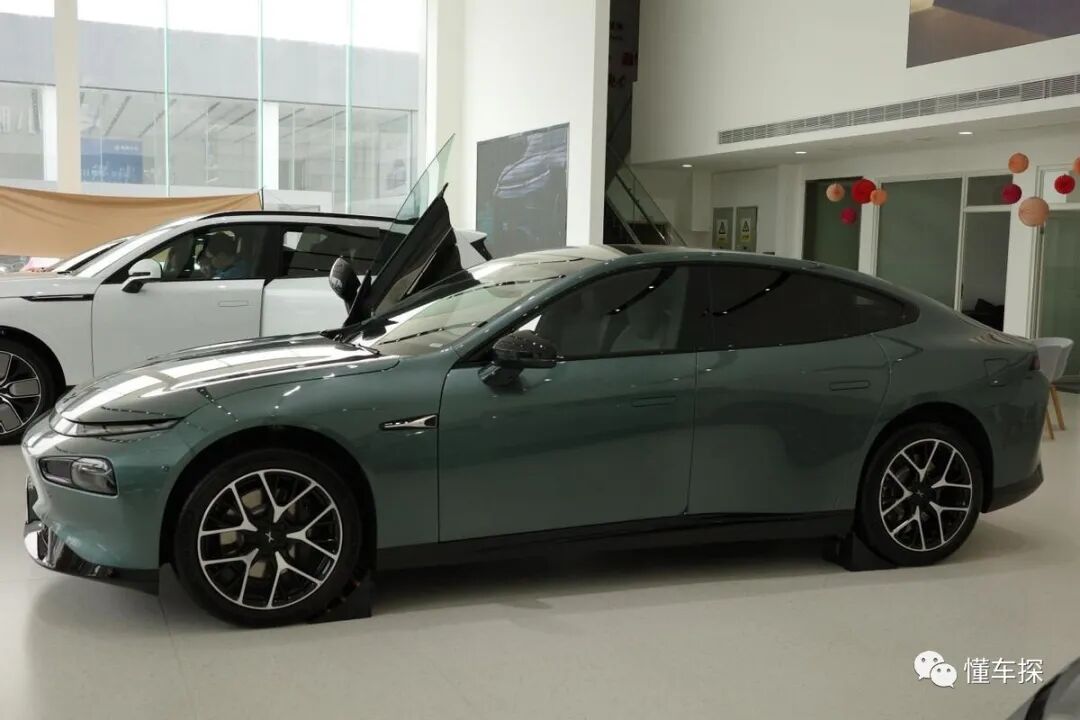展车外观颜色刚好是小鹏P7i相对小鹏P7新增的星际绿,这一款颜色选装价格是加5000元,实际效果非常不错,视觉偏深邃感,也有较润的金属色泽。