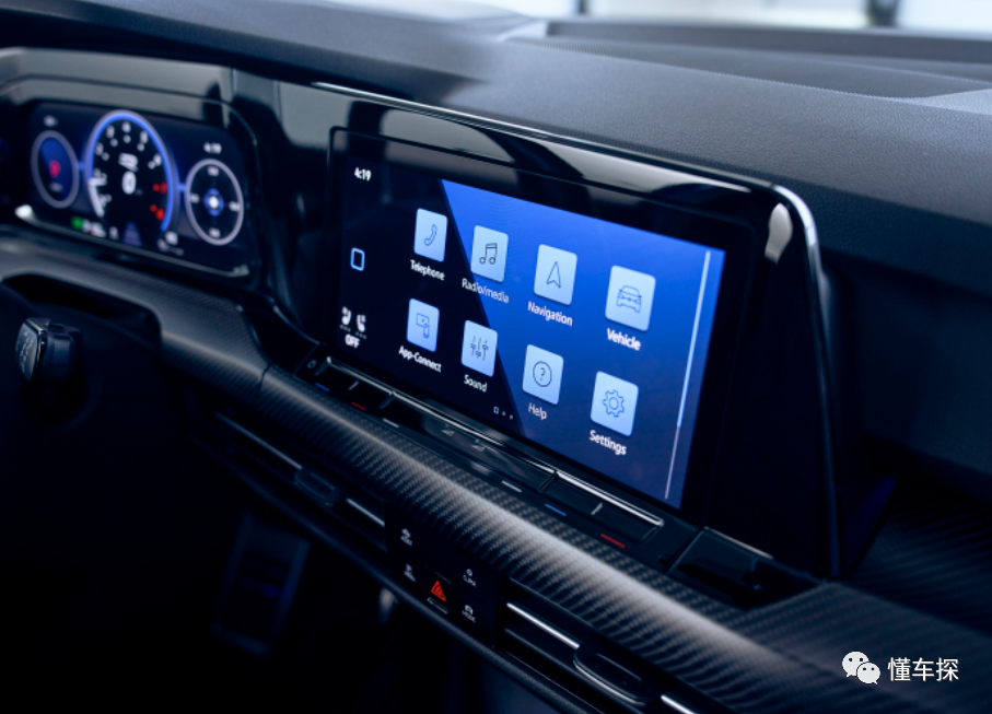 采用赛道风格的设计,车机屏幕和数字液晶仪表盘都是定制UI界面。