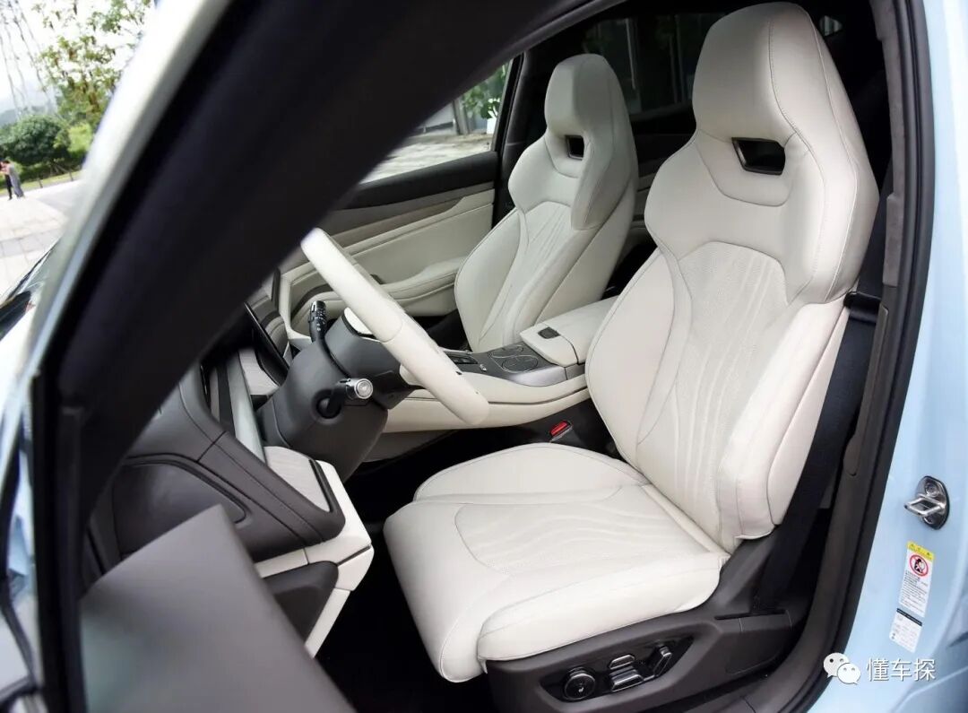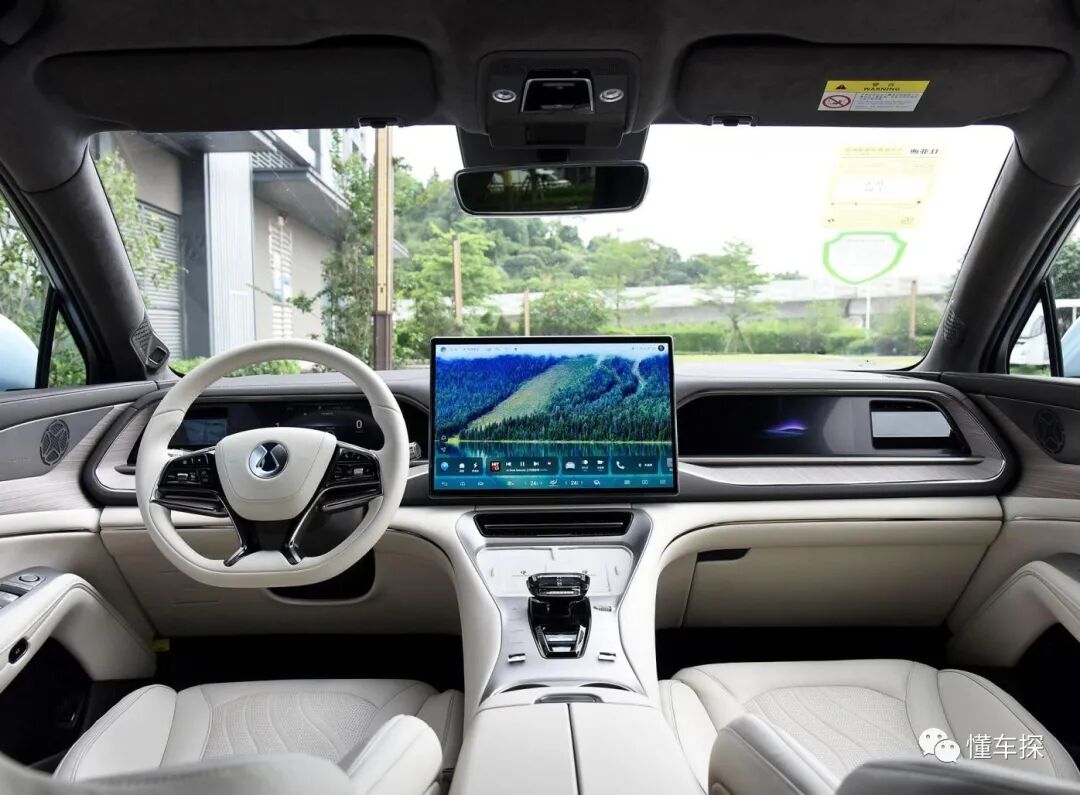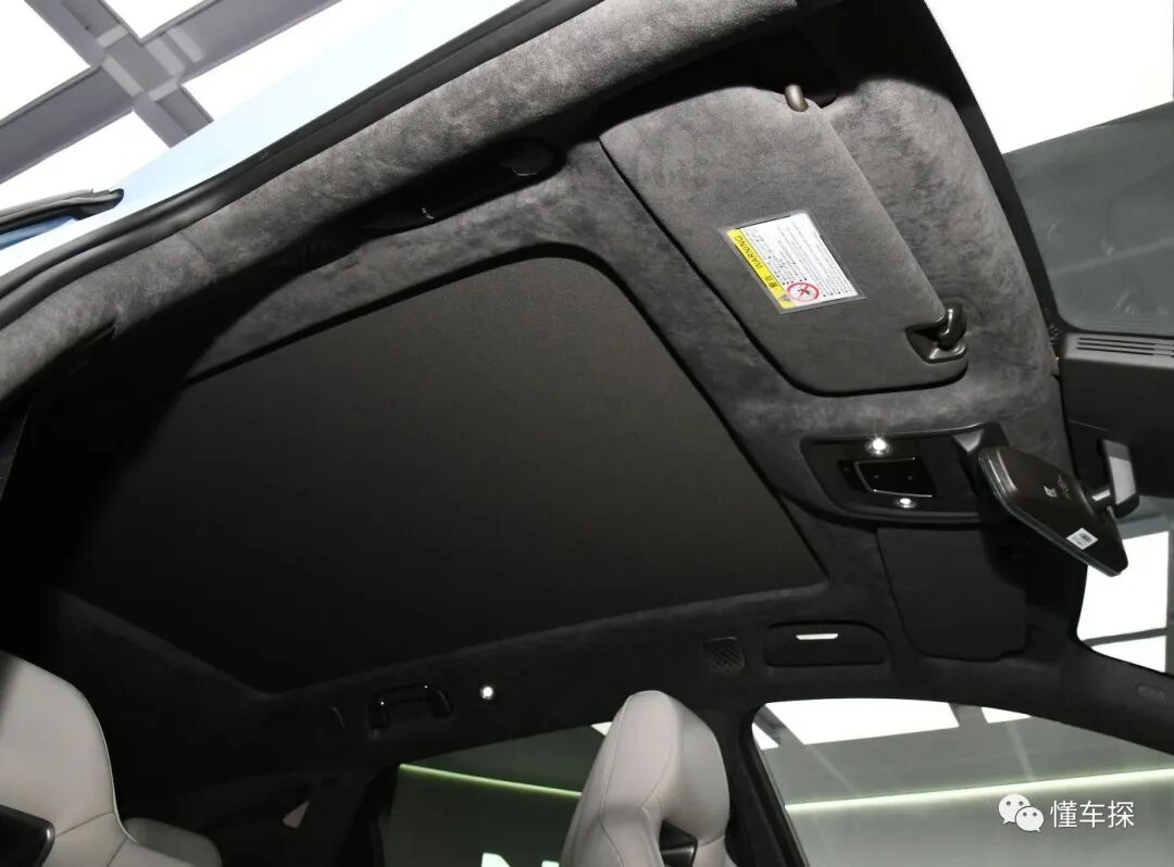 此外,腾势N7在车厢内用到了大面积皮质材料的包裹,甚至车顶棚也使用了翻毛皮材质,所以该车车厢内的豪华感也是呈现得比较不错的。