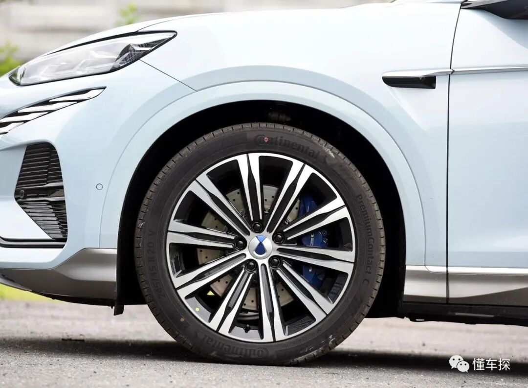 车身侧面,腾势N7的设计较为简洁,不过由于新车配备了隐藏电动门把手设计,所以车侧是有一定科技感的;此外,新车的腰线和窗线都采用了上扬的设计,配合它大尺寸的轮毂使得车侧也拥有了不错的运动感。