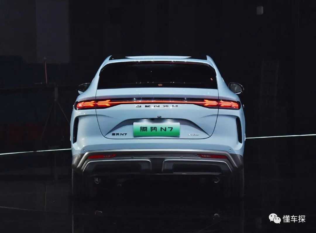 在配置方面,例如8气囊、L2级辅助驾驶、防侧翻系统、前后泊车雷达、360度全景影像、透明底盘、自动泊车入位、遥控泊车、电动感应式后尾门、全车无钥匙进入、对外放电、LED大灯、自适应远近光灯、全景天窗、前排多层隔音玻璃、10.25英寸全液晶仪表、17.3英寸中控屏、10.25英寸副驾娱乐屏、车载KTV、方向盘加热、AR-HUD增强现实抬头显示、自动防眩目后视镜、电调座椅、座椅加热、座椅通风、座椅按摩、帝瓦雷音响、128色车内氛围灯、自动分区空调、热泵空调、车内香氛装置、车内负离子发生器等在其他车型顶配出现的配置,腾势N7均做到了全系标配,所以腾势N7可谓是一款“让顶配变标配”的车型。
