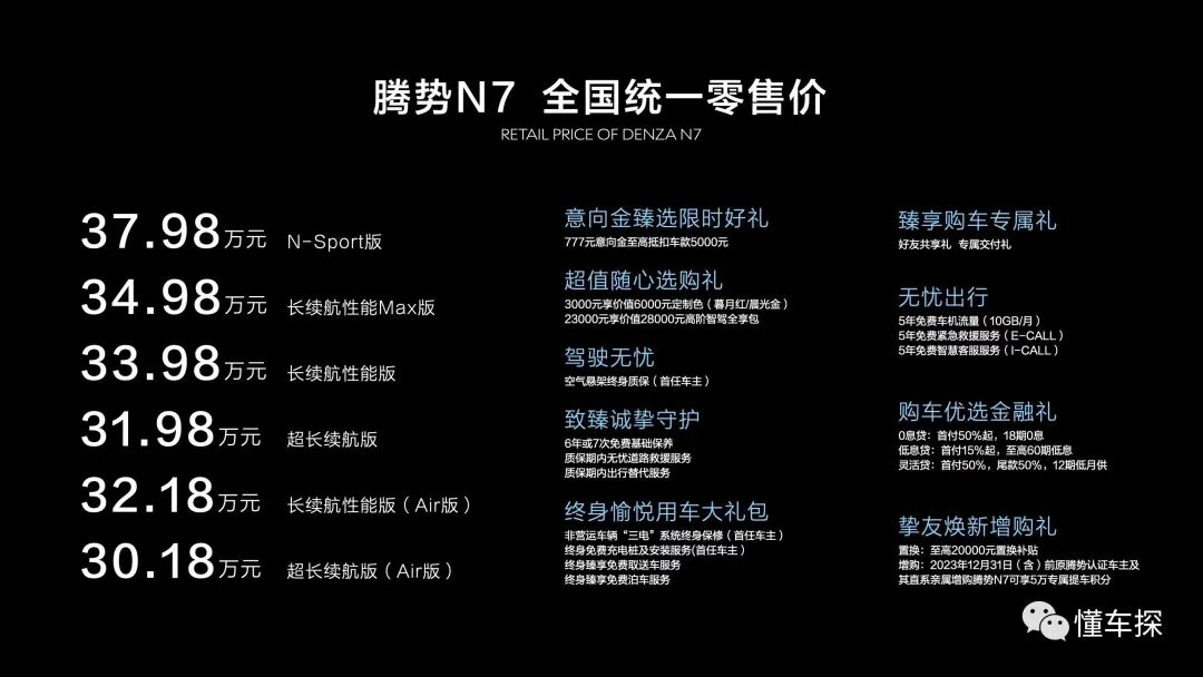 首先,我们来看看价格,腾势N7的指导价是从30.18万起至37.98万止。