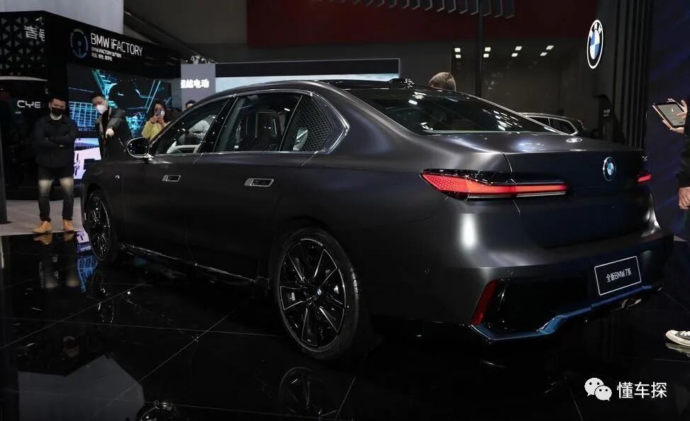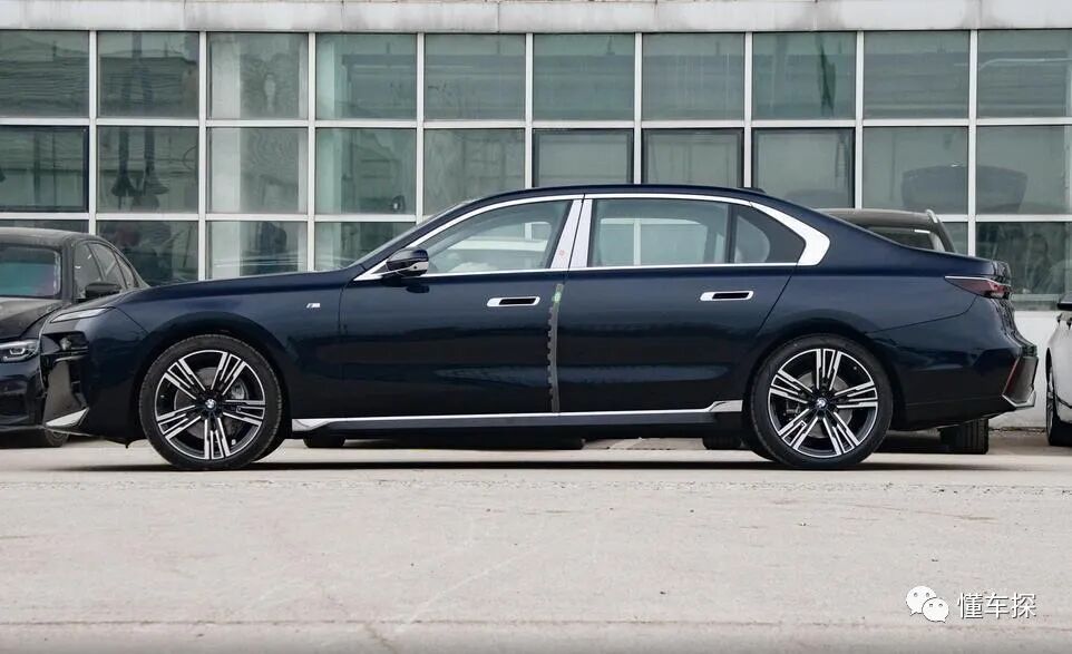 车身侧面,宝马7系为了兼顾i7的高底盘(为了增加电池包不显得突兀),车身高度来到了1548mm,即便和一些小型SUV停在一起,也会显得它压迫感十足。