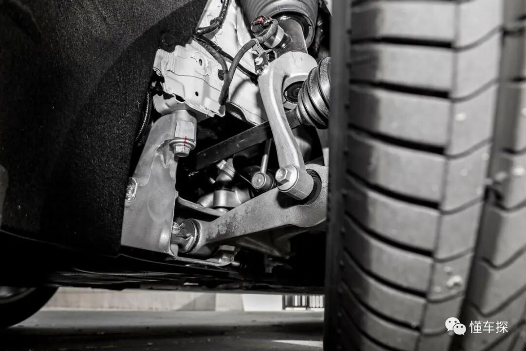 梦想家除了有大量铝合金用料外,我们还见到了前双叉臂+后五连杆的高规格悬架;反观腾势D9,它的用料多以铸铁为主,悬架也是10万级车型上常见的前麦弗逊+后多连杆。