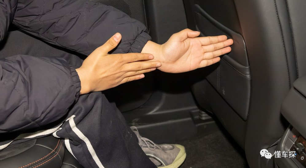 第二排为独立座椅设计,两个座椅均带有腿托,靠背角度可向后调节到41°,靠背和大腿夹角可达105°,坐姿相当舒适。