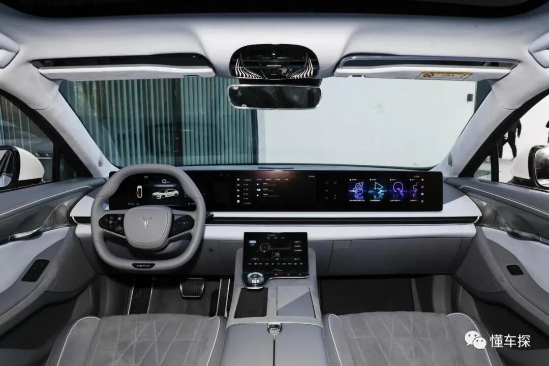 岚图追光的内饰风格明显主打科技豪华风,超大尺寸的三联屏能够带来非常强大的视觉冲击力,并且车内基本上见不到实体按钮,让整个内饰风格看上去更加简约与科技。