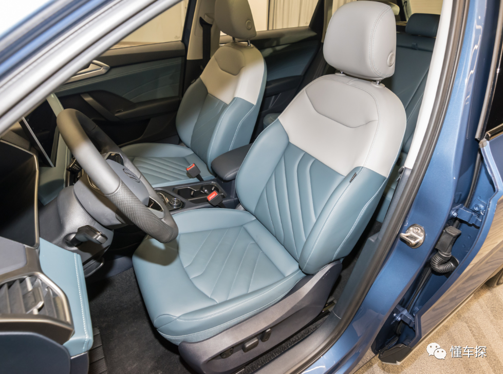 座舱内部还加入双色搭配,目前公布的车型实拍图中,新车的中控台部分区域和座椅采用墨绿色,让座舱内多了几分活泼。