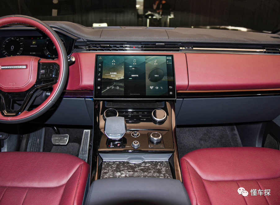 汽车内饰部分,路虎揽胜运动版强调车内的战斗属性,车内大规模的使用真皮材质和碳纤维材质。
