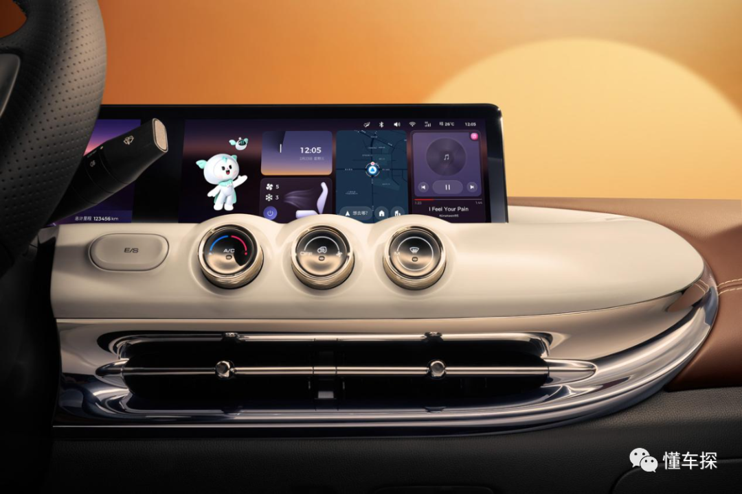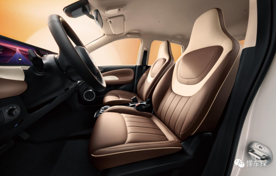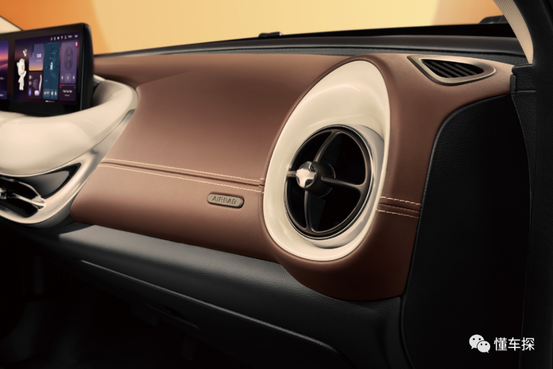新车采用了撞色设计,黑、白、棕经典色的碰撞,搭配大面积皮质包覆和大量圆形几何设计元素,让其更有腔调。