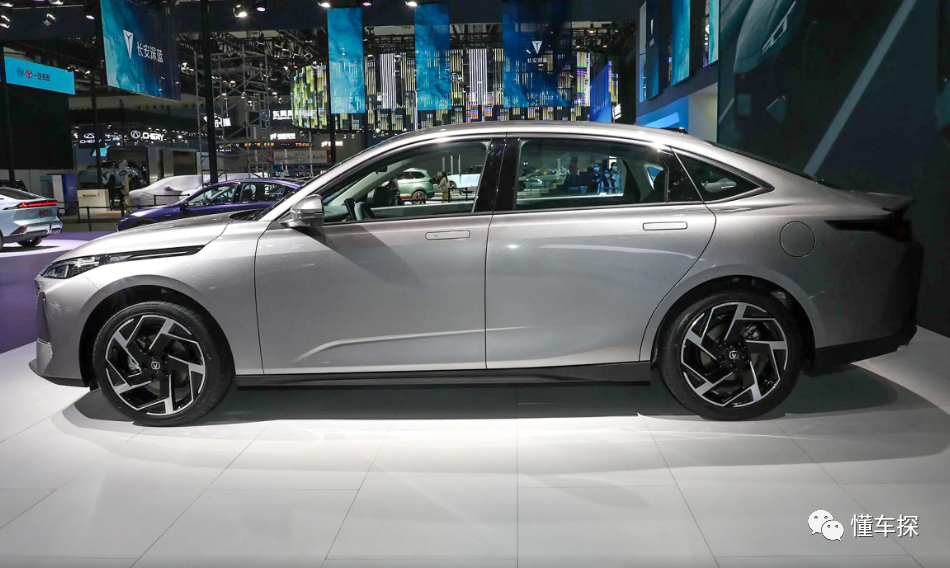 来到车身侧面,长安逸达并没有采用溜背车身,同时也没有采用掀背式尾门,再加上更显时尚家用的轮辋造型,使得该车的侧面看起来更加缓和。