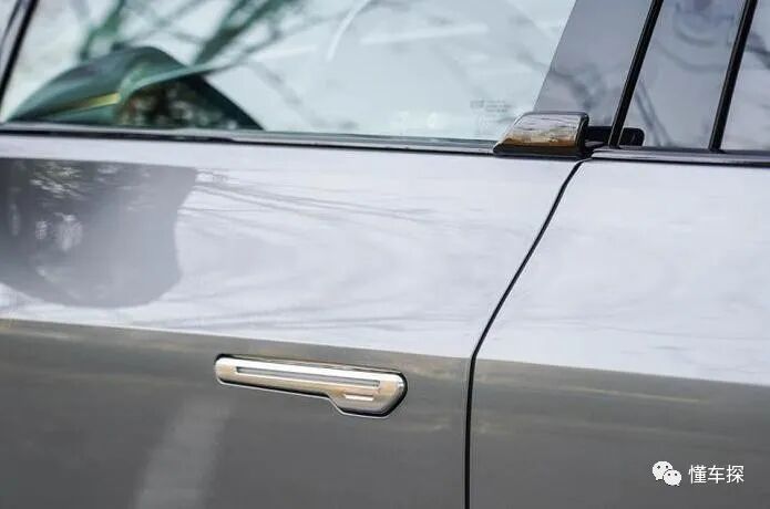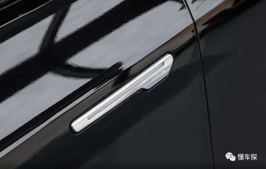 值得注意的是,为了贴合LYRIQ锐歌的新能源车身份,该车也采用了隐藏式门把手设计,但不同于常规的外拉开启方式,想要打开车门的话,需先按压门把手较宽的一侧,车门才会自动弹开一条缝隙,此时再拉B柱窗沿处的黑色把手才可开启车门。