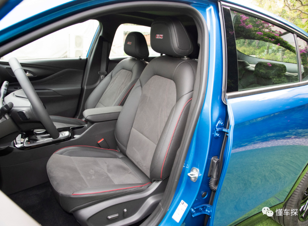 车头上是别克全新的三色盾标志,下面是黑色网格设计,右上角的红色GS标识也给全黑的中网增添了点调皮劲。