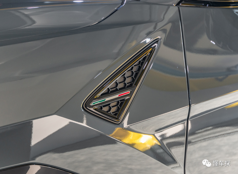 在前翼子板处能看到三角形的排气口装饰,细看还能发现其中绿白红的装饰条,这也是意大利国旗的配色。