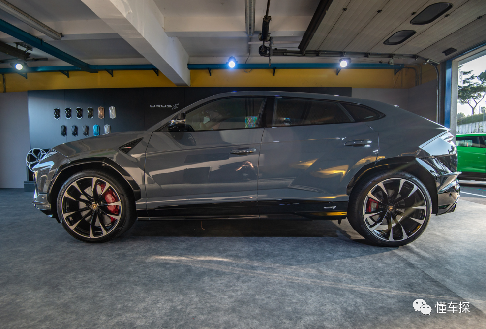 车身侧面的造型变动就不大了,车顶有明显的倾斜弧度,形成属于轿跑SUV的溜背线条,但是腰部和侧裙部分的线条却没有那么平滑,而是充满锐利感,展现出兰博基尼Urus