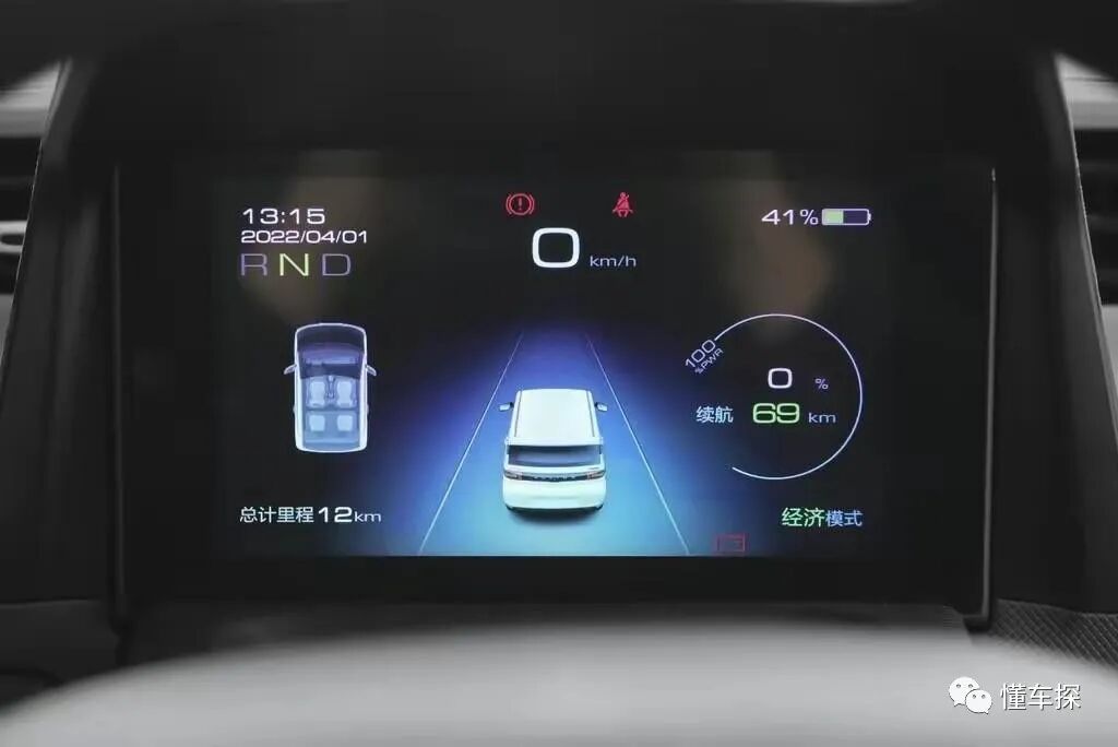设计在方向盘前方的液晶仪表盘,除了能够显示续航里程、电量等基础行车信息以外,还提供倒车影像的显示,考虑到宏光MINI