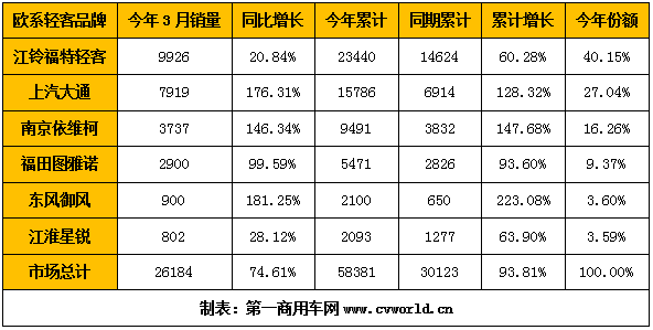 今年3月份,国内商用车行业表现继续抢眼,其中的欧系轻客细分市场销量定格在多少万辆?市场竞争格局有新变化吗?行业中的六位主角——江铃福特轻客、上汽大通、南京依维柯、福田图雅诺、江淮星锐、东风御风,各自的3月份及一季度销量又是多少呢?