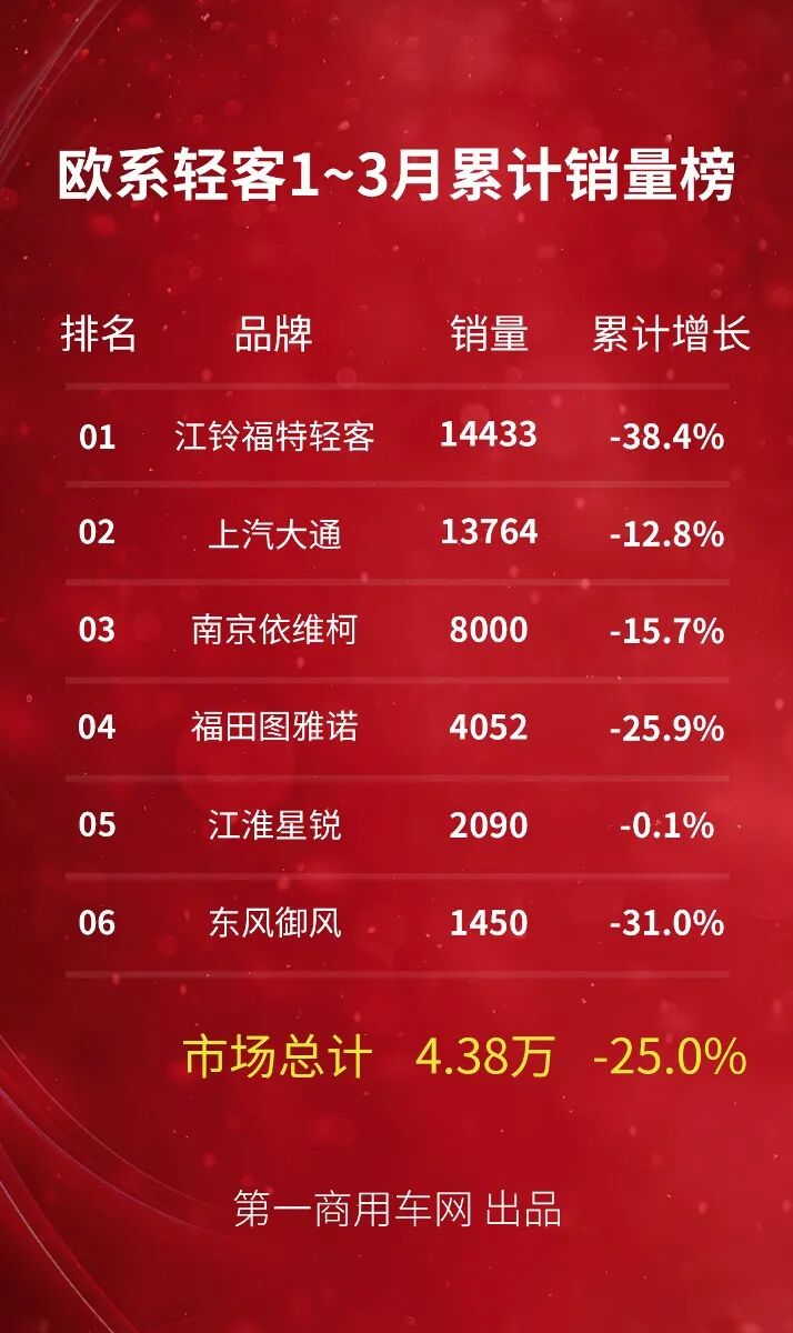 “覆巢之下无完卵”。在这个“旺季”变“淡季”的月份中,行业六强中绝大多数都呈现两位数的下降态势,只有江淮星锐同比微弱上升了1.4%(813辆)——逆势增长,尤为不易。今年一季度,欧系轻客市场累计销售4.38万辆,比上年同期的5.84万辆下降了25%,六强中有五家企业都是两位数的累计下降,只有江淮星锐是0.1%的微降。从份额增减来看,一季度取得市场“蛋糕”增长的企业主要有上汽大通MAXUS、南京依维柯和江淮星锐,其一季度份额分别上涨了4.39个百分点、2.01个百分点和1.19个百分点。