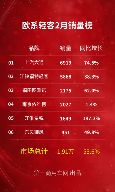 第三是部分厂家和渠道经销商为迎接春节后的小旺季,提前储备车辆。第四是轻客出口继续高歌猛进。根据第一商用车网了解的数据,今年2月份,国内欧系轻客出口双强——上汽大通和江淮星锐分别出口2100多辆和1200多辆,同比分别增长129%和22倍。旺盛的海外出口态势,为这个正在恢复中的细分市场再添一抹亮色。