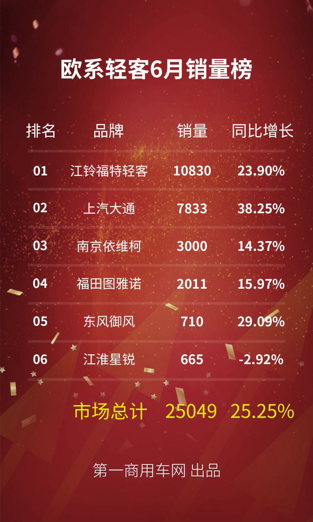 根据第一商用车网掌握的最新数据,今年6月份,我国欧系轻客市场销售各类车型2.5万辆,同比增长25.25%。月销2.5万辆,是今年以来欧系轻客市场销量的第二高点,比最高峰(今年3月旺季)仅仅少了约1100辆,从中也可见,欧系轻客市场6月份交出的成绩单可以说是非常可观。今年上半年,国内欧系轻客市场累计销售各类车型达13.02万辆,比上年同期大幅上涨52.16%,净增加了约4.46万辆。超13万辆这个半年销量,不能说是“后无来者”,但已经是“前无古人”,它刷新了半年销量的历史纪录。