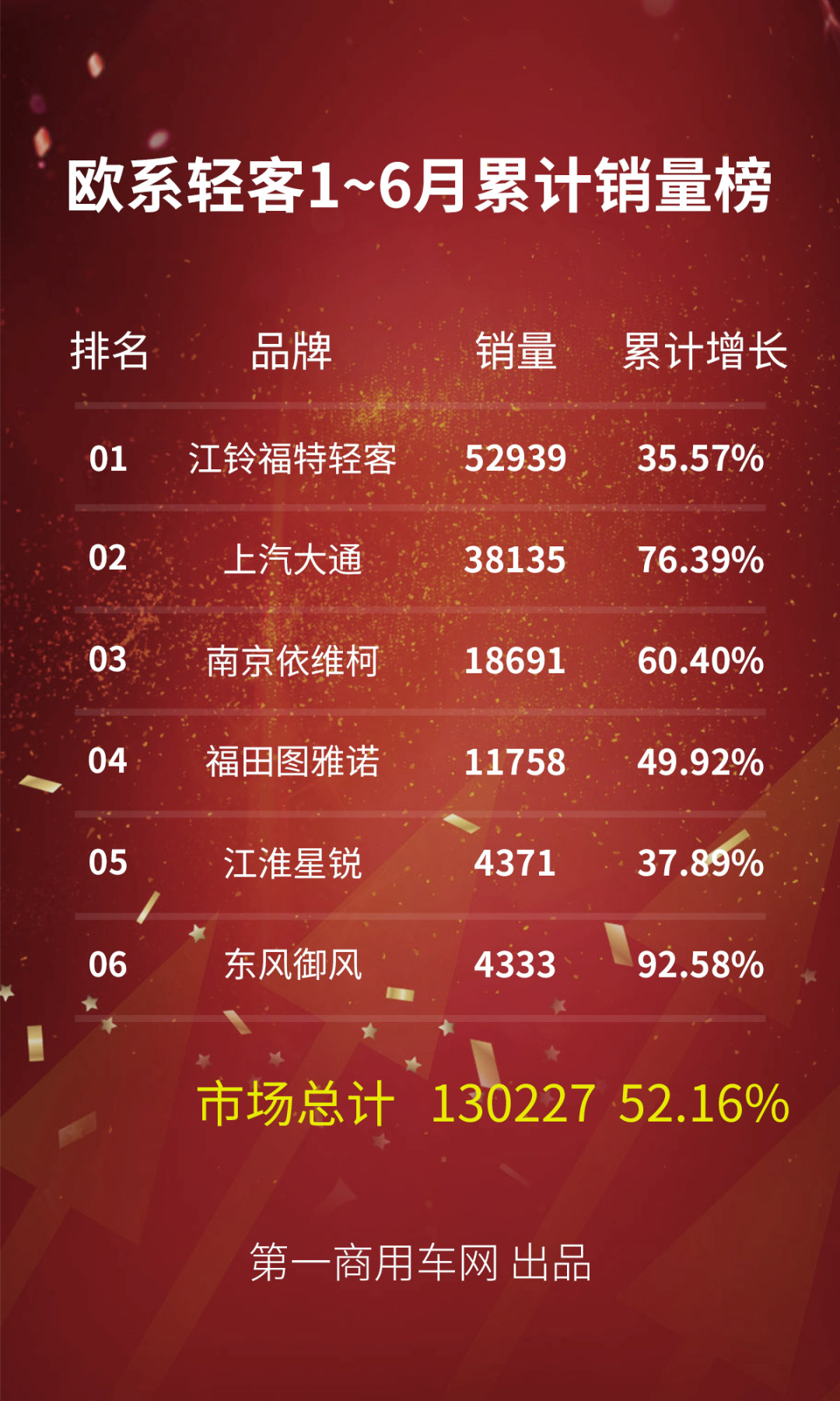 在市场整体强劲的拉动下,这个细分市场上的六家企业都取得了不错的销量成绩。具体来看,今年上半年,增长最快的是东风御风,上半年同比增长92.58%至4333辆,份额提升至3.33%(去年同期为2.63%);其次为上汽大通MAXUS,今年上半年销量达到3.81万辆,同比大幅增长76.39%,市场份额上升至29.28%;南京依维柯累计销量同比上升60.40%至1.87万辆,市场占有率上升至14.35%,增加了0.7个百分点。当然,行业第一名仍然是江铃福特轻客,今年上半年同比增长35.57%,累计销量为5.29万辆(含江铃福特轻客和江铃特顺轻客),市场份额接近41%。福田图雅诺和江淮星锐1-6月销量表现也不错,分别销售1.18万辆和4371辆,同比分别增长49.92%和37.89%。