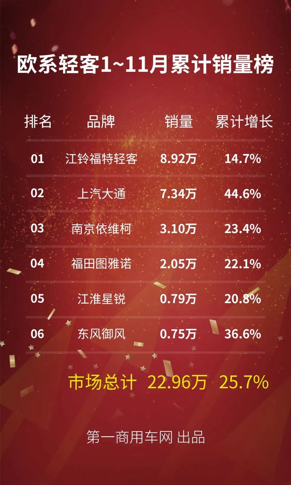 尽管绝大多数企业11月份销量都出现了两位数的同比下滑(只有上汽大通宽体轻客是同比增长的),但从累计来看,这个细分市场上的六家企业今年以来的销量成绩同比都是两位数的正增长,多数企业全年销量创下新纪录也不是问题。1-11月,行业第一名仍然由江铃福特轻客保持,其11月份销量接近7600辆(含福特全顺和江铃特顺),今年累计销售8.92万辆,同比上涨14.7%,市场占有率保持在4成左右。