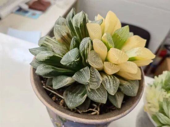 万象锦同样是一种稀有的玉露,它的叶片数量可能还不到10片,但是价格就要逼近10万元,可以说是一片一万元的天价。万象锦贵就贵在它透明的叶色,和渐变的光泽,这种优势十分罕见。