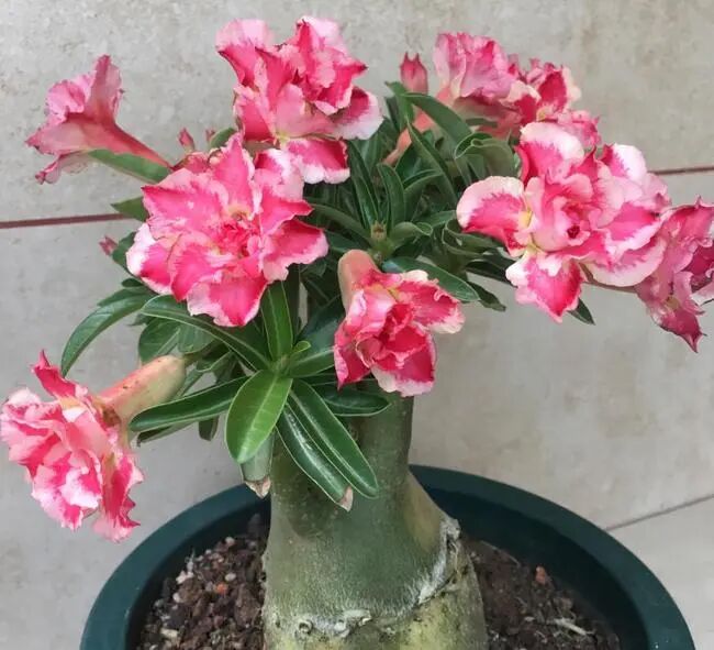 沙漠玫瑰传承了沙漠类植物优良的传统,在它的枝条中间有一个巨大的块状根茎,这种根茎就好像是一个储水箱,帮沙漠玫瑰储存了大量的水分。所以哪怕你忘记浇水,沙漠玫瑰也绝不会干死,并且一到开花季节,沙漠玫瑰开出的花朵无比绚烂,可以说比得上玫瑰花。