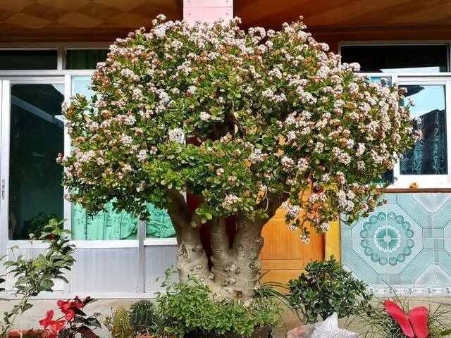 玉树也能开花?这是很多人听说这个事情的第一反应,因为玉树这种植物许多人都养过,不过哪怕养了十来年也从来不见它开花。其实人们并不知道,玉树的寿命极长,只要你坚持养下去,就会见到满树爆盆开花的效果,图片为证,特别罕见。