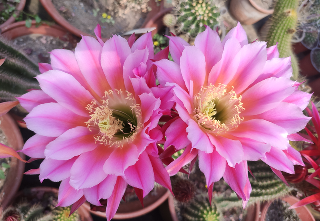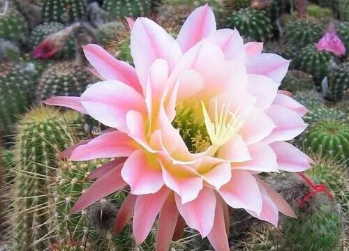 花毛柱是一种仙人掌科的植物,看起来就像一棵仙人球一样,但是它可以长成大型的圆柱体,开花的时候更是震撼,可以开出鲜艳无比的巨大花朵,而且一开就可以开爆盆,十分惹人喜爱。
