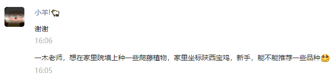 这位花友叫《小羊》,他问想在家里种一些爬藤植物,坐标山西宝鸡,希望让我给它推荐一些品种。