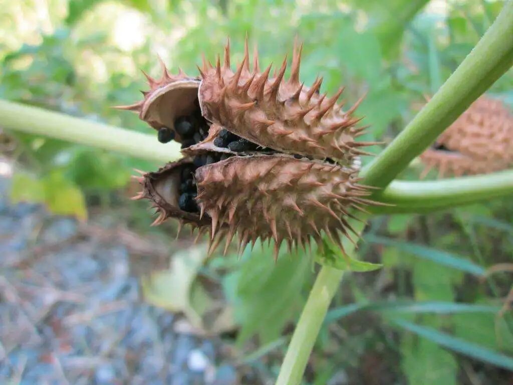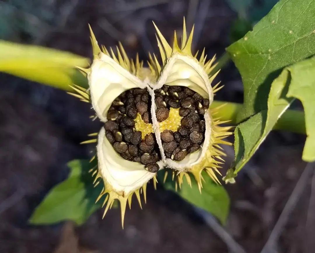 裂开来之后就能看到,在里面包着有很多像芝麻一样大的籽,这个籽毒性非常大,据说这么小一粒就能够毒倒一头牛,所以说我们不要用手去触碰它,还有不能误食。