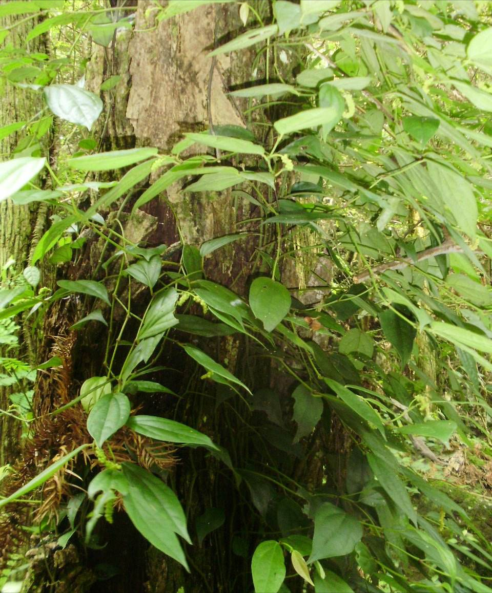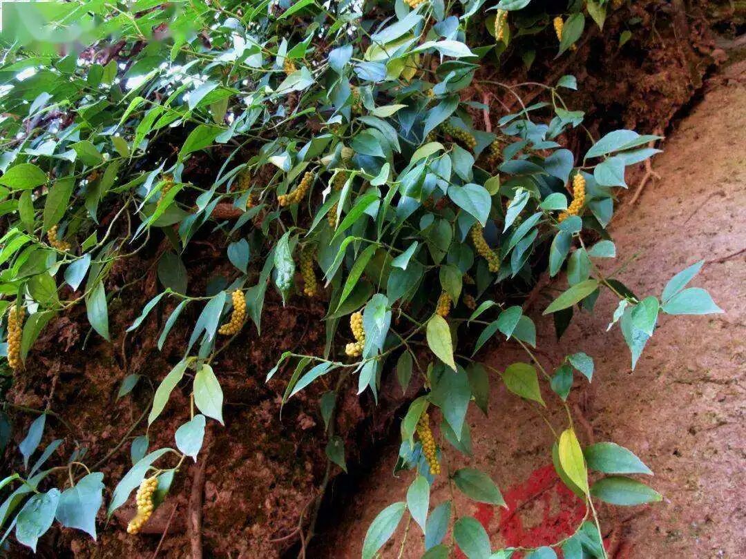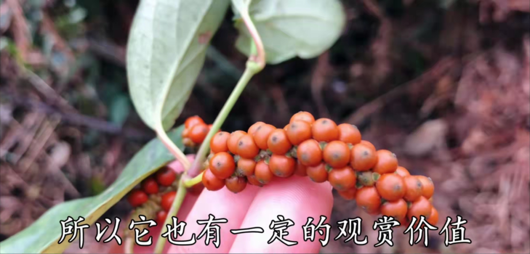 那我们今天要找到这种草,它也是经常喜欢攀爬在石头皮上生长,你看就是眼前的这种植物了,在我们当地大家喜欢叫它石南藤,它的学名叫山蒟,是胡椒科胡椒属的一种多年生的攀援藤本植物,它的攀附能力非常强,长得经常可以长到好几米。