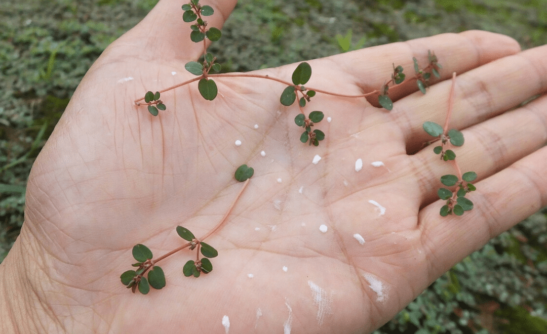 大家看这种植物它非常的神奇,它是铺地式而生长。我们可以看到它的叶片是呈椭圆形,淡淡的紫色,叶片是这种对生生长,在它的一个每一个节点上面,因为到了冬季的时候,它的花蕾又是它的一个种子非常的细小,看起来是非常的与众不同。它的一个小小的枝杆上面有这种细细的小绒毛所包裹着,最主要它的枝杆一折断,就会流出乳白色的液体,所以在我们当地也有人称它为奶浆草。