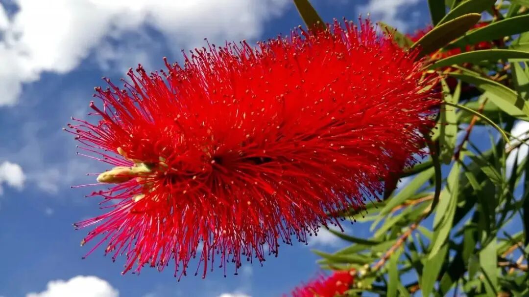 大家看,满树火红的花有人用“万条红丝绦”“绿难掩其妖”来形容真的是非常的贴切。它的名字叫红千层,是桃金娘科红千层属的一种小乔木,它的故乡是来自遥远的澳大利亚,叶子革质,线形,它的树皮坚硬。