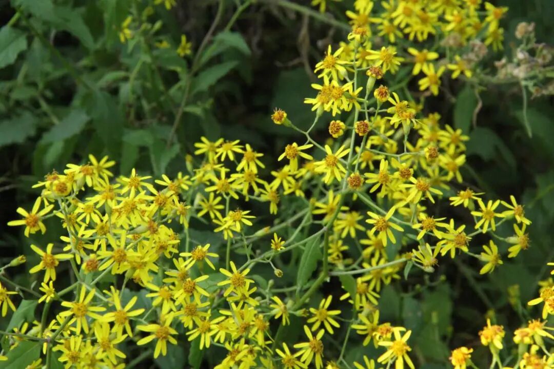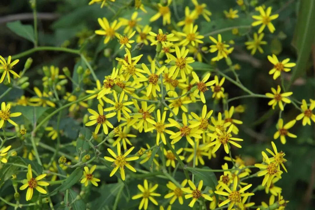 大家看千里光开的花是不是也像一朵朵的野菊花呢?就是它的花比野菊花要更稀疏一些,复聚伞状的这种圆锥花序,所以开起来,看着都是一丛一丛的,它的别名还叫九里明、蔓黄、菀、箭草等。