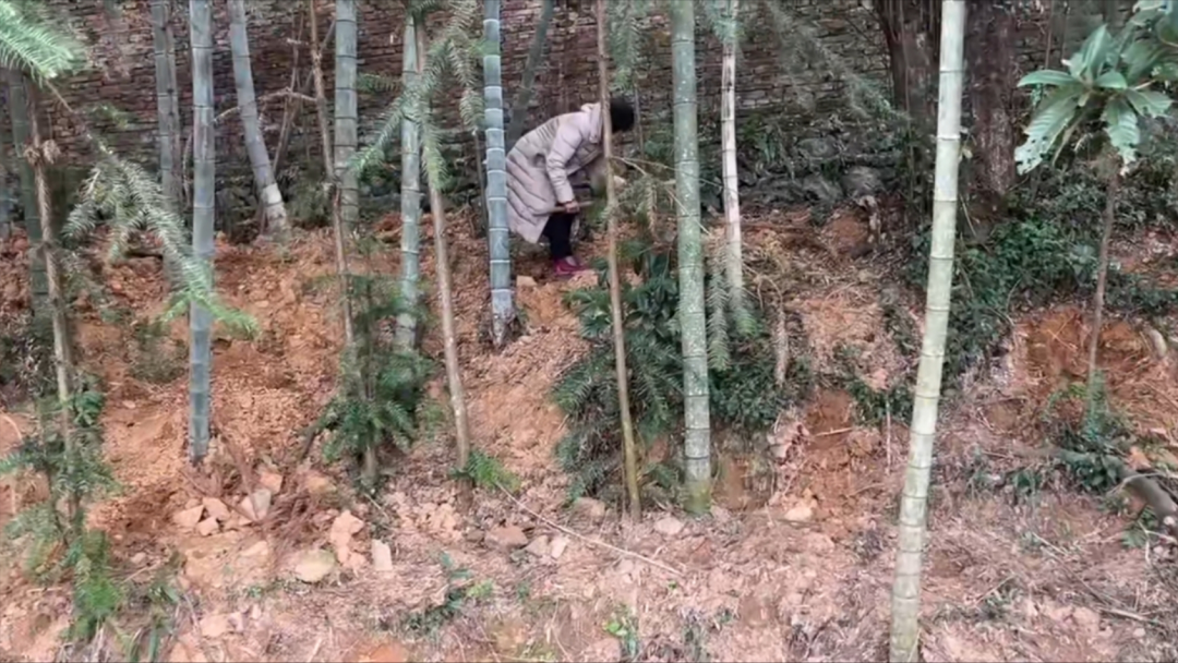 眼前我们所看到的这一片竹林,是离我们村里最近最近的一片竹林了。年前的时候,这片竹林很多老乡,他们在这边挖冬笋,我们能看到这片竹林下面都被锄头挖过的痕迹。