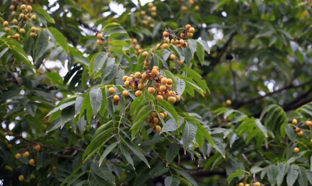 它的花期一般是五六月间,到七月左右,就会长出这种嫩果了,它完全成熟以后,就是这样子黄黄的颜色。无患子在中国传统里俗称是鬼见愁。