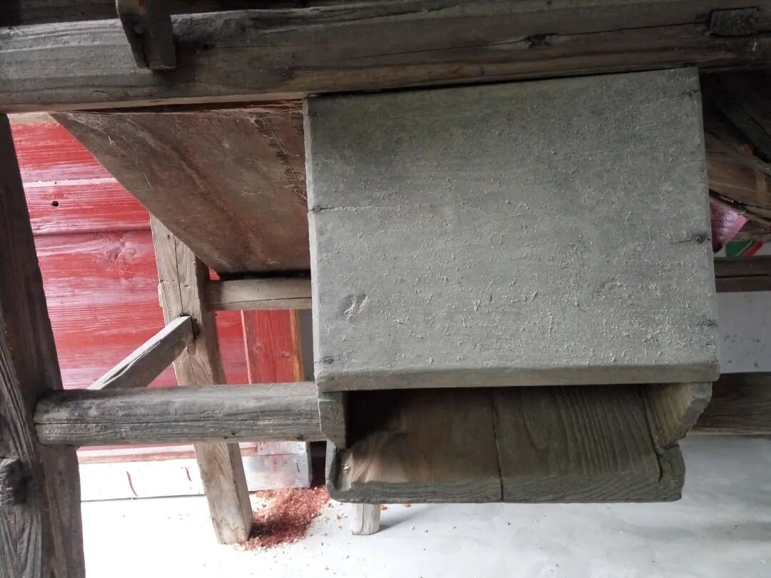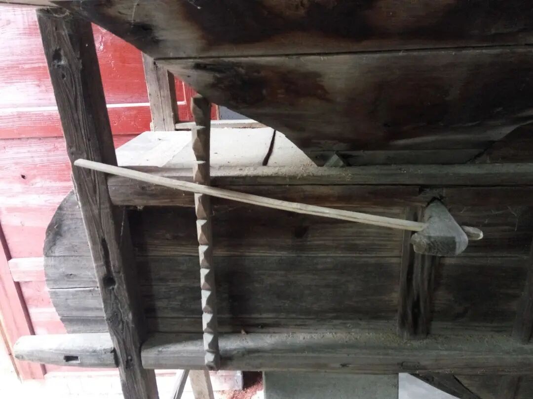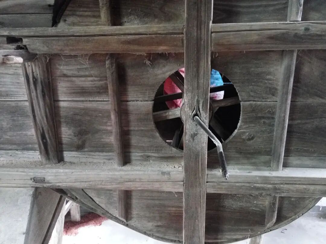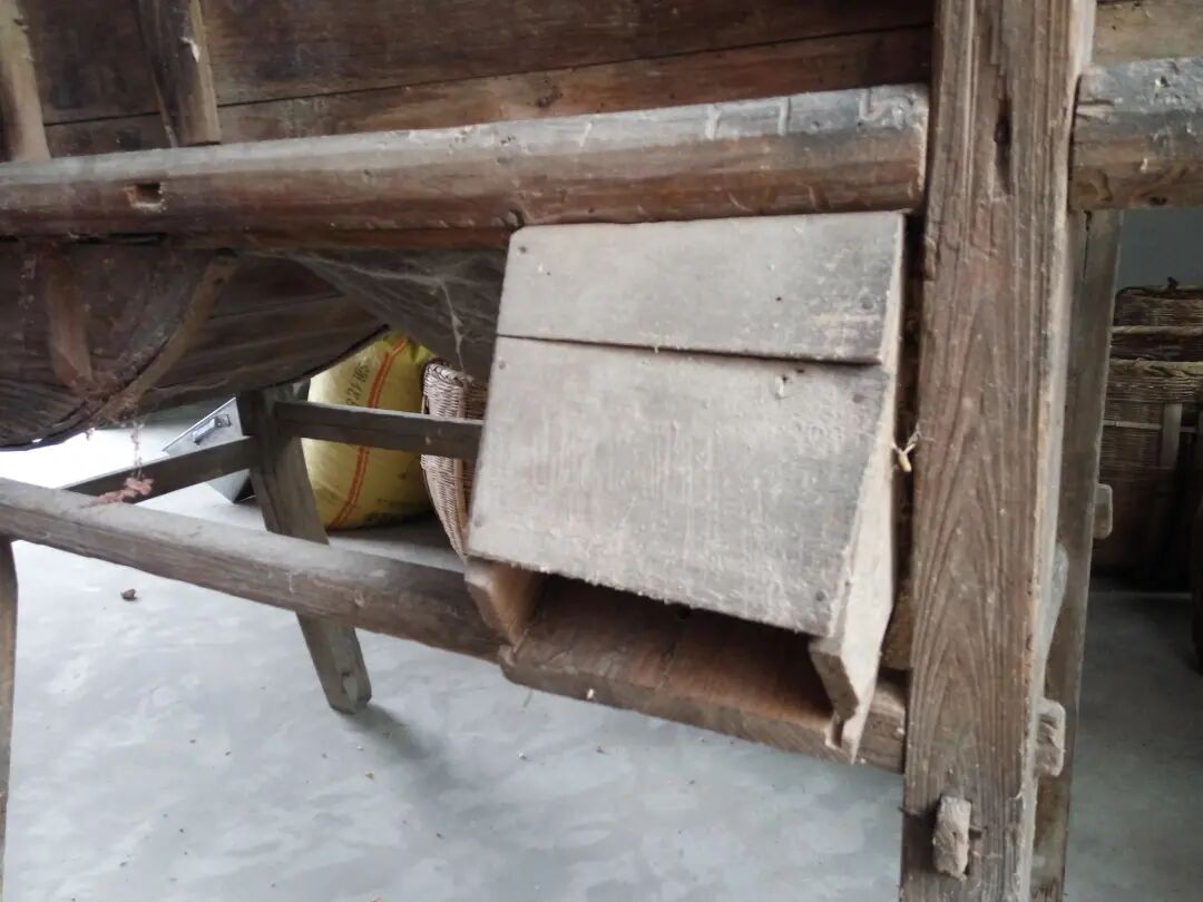 这是风车的把手,用来旋转风车使之出风从而把秕谷吹走。从左往右旋转,带动风车里面的转轮转动,就会出风,风把从上面掉落下来的稻谷里面的灰尘,杂质,叶子等东西吹出来。