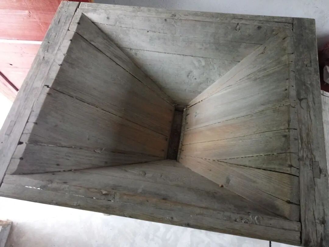 这个是装稻谷的漏斗。稻谷装在这个漏斗里面,下面有一块挡板,用图二的控制开关控制稻谷下落的多少。这个漏斗一般是可以装60斤左右的稻谷,也就是一箩筐的稻谷,倒完一箩筐稻谷后,再把箩筐放在下面来接住掉下来的稻谷。这样车完一箩筐再车另一箩筐。